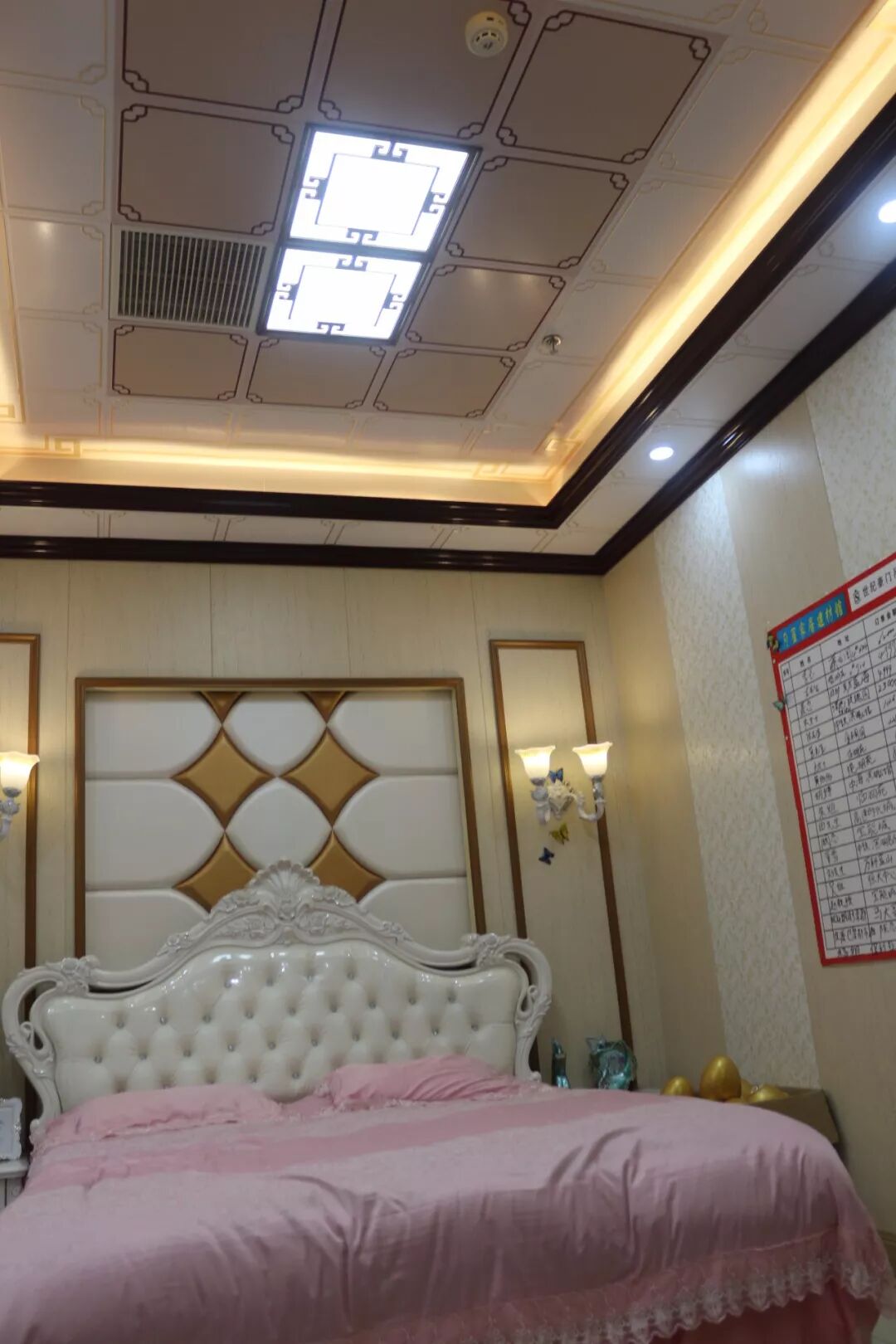 (古典欧式风格的卧室处处表现出高端奢华的视觉感,世纪豪门灯光梁在顶部的应用,让原本明快的卧室空间变得浪漫与格调,提升爱情的温度)